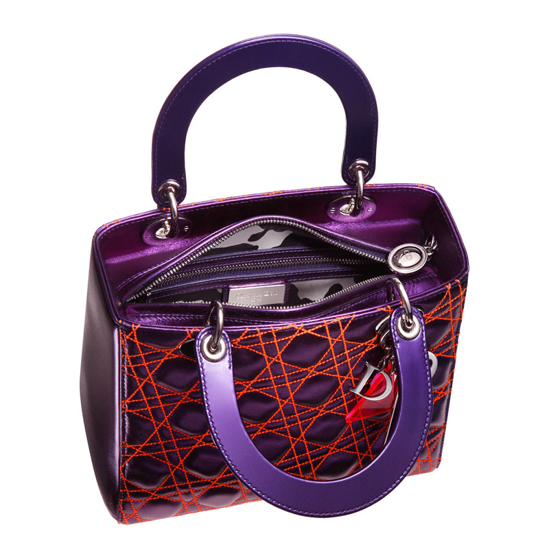 Dior, Оригинальная квалитетная реплика. Из натуральной кожи,ручки из лакированной кожи. Цвет: пурпур-металлик(Metallic purple)с оранжевой строчкой, с фурнитурой под платину. Фирменный аксессуар из букв на ручке. Размер сумки: 9,45х7,87х4,33дюйма